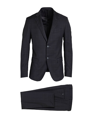 single-breasted suit, gabardine, checked, no appliqués, lapel collar, long sleeves, fully lined, button fastenings, one chest pocket, flap pockets, dry clean, do not bleach, do not tumble dry