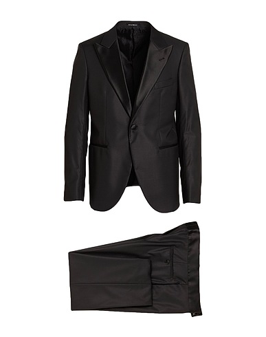 single-breasted suit, cool wool, solid color, satin trims, lapel collar, long sleeves, buttoned cuffs, fully lined, 1 button, welt pockets, one chest pocket, dry clean, do not bleach, do not tumble dry