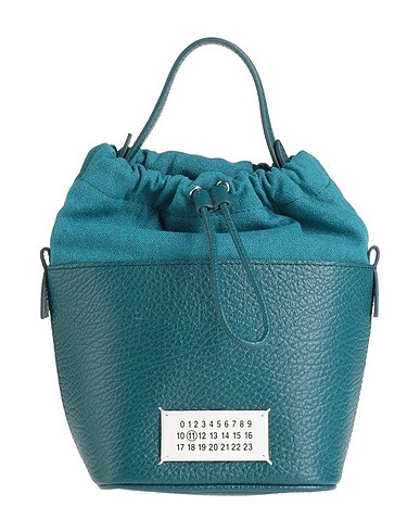 bucket bag, pebbled-leather, canvas, solid color, brand logo, drawstring fastening, fully lined, internal pocket, detachable top handle, detachable shoulder strap, metallic straps, feet at base, small size, contains non-textile parts of animal origin