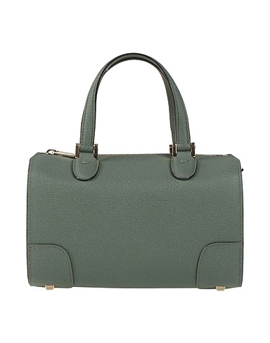 bowler bag, pebbled-leather, solid color, brand logo, zipper fastening, leather lining, external pocket, top handles, detachable shoulder strap, feet at base, medium size, contains non-textile parts of animal origin