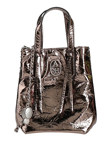 shopper bag, synthetic material, metallic, solid color, brand logo, magnetic fastening, fully lined, double handle, small size