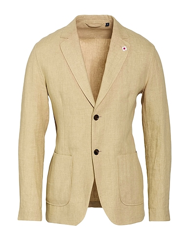 single-breasted blazer, linen, solid color, brand logo, lapel collar, long sleeves, unlined, button fastenings, patch pockets, machine wash or dry clean, do not bleach, do not tumble dry