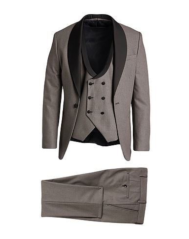 single-breasted suit, jacquard, stretchy fabric, two-tone, no appliqués, lapel collar, long sleeves, fully lined, zipper fastening, button fastenings, multipockets, dual back vents, raw-cut hem, low waisted, belt loops, 3-piece set, dry clean, do not bleach, do not tumble dry