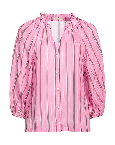 shirt, woven, striped, gathered, crewneck, 3/4 length sleeves, unlined, button fastenings, side slit hemline