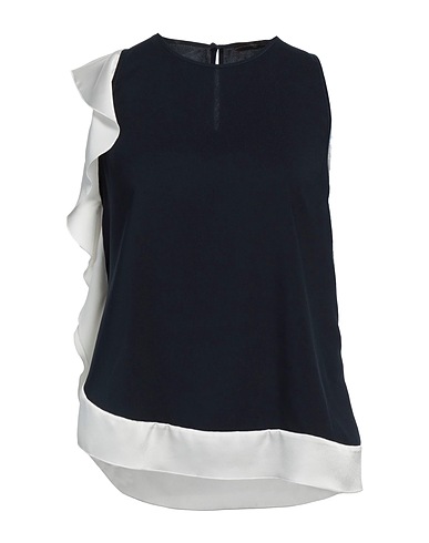 top, crepe, two-tone, no appliqués, crewneck, sleeveless, hand wash or dry clean, do not bleach, do not tumble dry