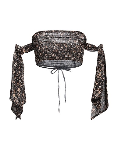 bandeau top, crepe, floral-print, shirred, cropped, off-the-shoulder, machine wash or dry clean, do not tumble dry