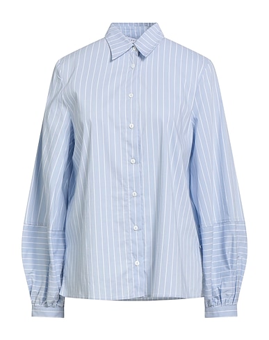 shirt, poplin, stretchy fabric, striped, gathered, classic collar, long sleeves, buttoned cuffs, button fastenings, side slit hemline, dry clean, do not bleach, do not tumble dry
