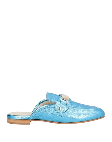 leather, textured leather, laminated effect, detachable application, brand logo, solid colour with appliqués, leather backing, round toeline, flat, leather sole, contains non-textile parts of animal origin, mules model
