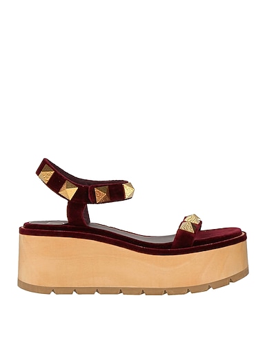 sandals, velvet, plain colour with appliqués, brand logo, studs, snap fastenings, round toe, wedge, rubber cleated sole, leather lining, contains non-textile parts of animal origin