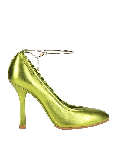pumps, leather, metallic, plain colour with appliqués, detachable application, crystals, leather lining, ties at ankle, round toe, geometric heel, covered heel, leather sole, contains non-textile parts of animal origin
