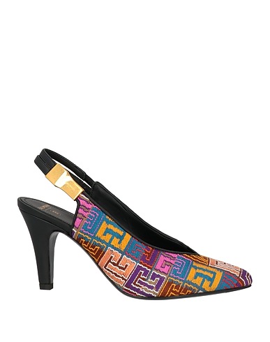 jacquard, leather, brand logo, metal applications, multicolour, leather lining, pointed toe, cone heel, leather sole, contains non-textile parts of animal origin, slingback pumps
