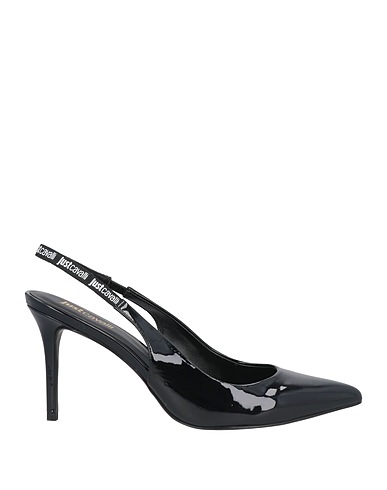 coated fabric, patent-effect, brand logo, plain colour, lined interior, elasticated inserts, pointed toe, stiletto heel, covered heel, rubber sole, slingback pumps