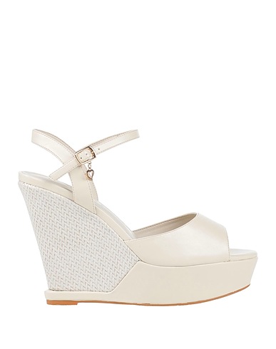 ankle strap sandals, coated fabric, brand logo, plain colour, leather lining, buckle fastening, round toe, wedge heel, covered wedge, rubber sole, contains non-textile parts of animal origin