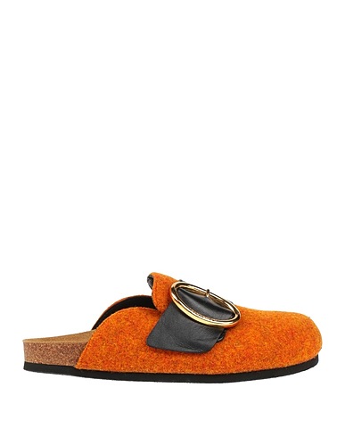 clogs, boiled wool, two-tone, brand logo, buckle, round toe, flat, rubber sole, leather lining, contains non-textile parts of animal origin