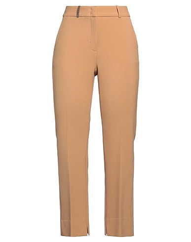 straight-leg trousers, crepe, stretchy fabric, plain colour with appliqués, leather trims, high waisted, regular fit, zip fastening, hook fastenings, side slit hemline, multipockets, machine wash or dry clean, do not bleach, do not tumble dry, contains non-textile parts of animal origin