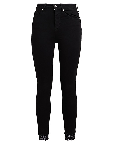 plain weave, lace, sequins, tiers, solid colour, high waisted, tapered leg, slim-leg pants, zipper closure, button closing, multipockets, stretch, 5 pocket
