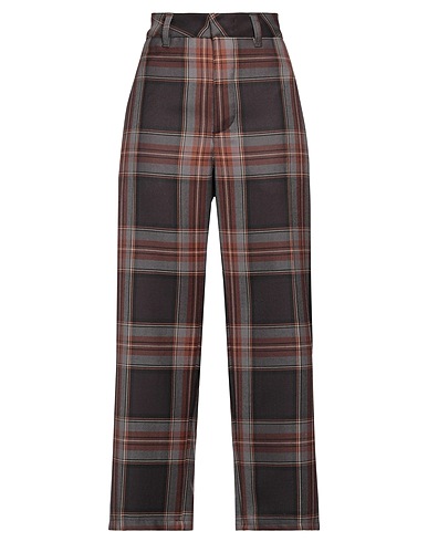 wool, no appliqués, tartan pattern, high waisted, regular fit, button fastenings, hook fastenings, multipockets, dry clean, do not bleach, do not tumble dry, straight-leg trousers