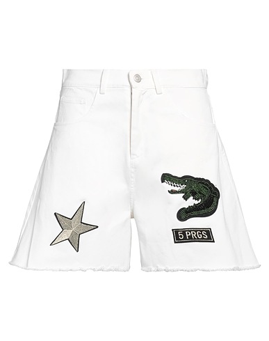 shorts, denim, stretchy fabric, plain colour with appliqués, beads, brand logo, coloured wash, high waisted, zip fastening, button fastenings, five pockets, machine wash, do not bleach, do not tumble dry