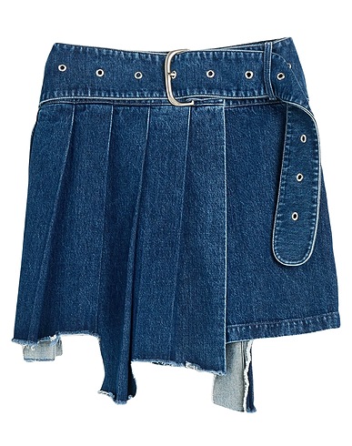 pleated skirt, denim, plain colour, belt, medium wash, unlined, snap fastenings, machine wash, do not bleach, do not tumble dry