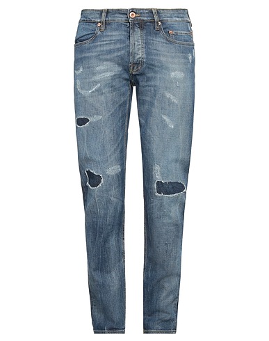 tapered jeans, denim, faded, distressed, stretchy fabric, plain colour, brand logo, medium wash, mid rise, regular fit, button fastenings, five pockets, hand wash, do not bleach, do not tumble dry