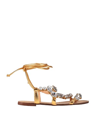 sandals, leather, coated effect, metallic, plain colour with appliqués, crystals, leather lining, ties at ankle, round toe, flat, rubber cleated sole, contains non-textile parts of animal origin