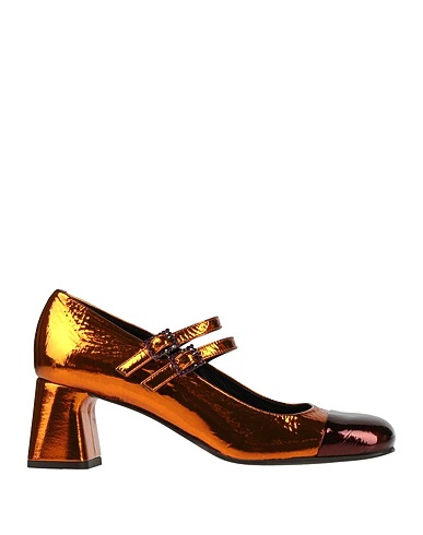 mary jane pumps, leather, metallic, two-tone, no appliqués, leather lining, buckle fastening, round toe, square heel, covered heel, rubber cleated sole, contains non-textile parts of animal origin