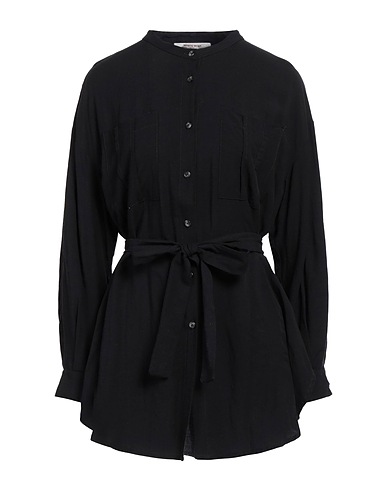woven, belt, solid color, mandarin collar, long sleeves, button fastenings, two breast pockets, long shirt