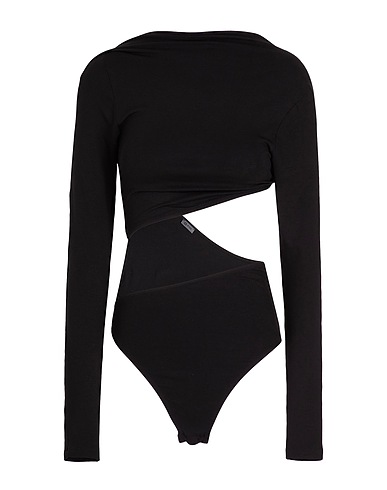 jersey, cutout, open back, solid color, draped neckline, long sleeves, snap fastenings, hook fastenings, stretch