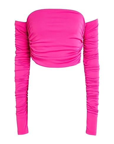 off-the-shoulder top, jersey, solid color, gathered, long sleeves, stretch, hand wash or dry clean, do not tumble dry