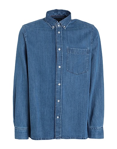 denim, brand logo, solid color, medium wash, button-down collar, long sleeves, buttoned cuffs, button closing, single chest pocket, side slit hemline