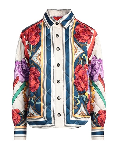 overshirt, satin, quilted, floral-print, no appliqués, classic collar, long sleeves, fully lined, snap fastenings, dry clean, do not tumble dry