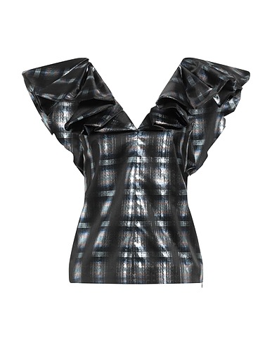 ruched top, crepe, metallic, ruffles, tartan pattern, deep neckline, sleeveless, fully lined, without pockets, dry clean, do not bleach, do not tumble dry
