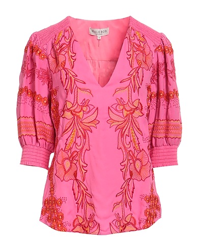 bohemian blouse, crepe, gathered, embroidered, floral-print, v-neck, 3/4 length sleeves, fully lined, without pockets, machine wash, do not bleach, do not tumble dry