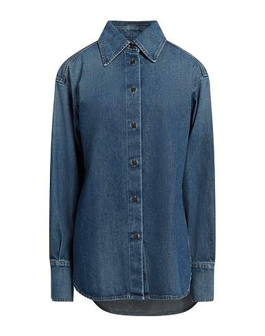 denim, faded, solid color, no appliqués, medium wash, classic collar, long sleeves, buttoned cuffs, button fastenings, asymmetric hem, machine wash or dry clean, do not bleach, do not tumble dry