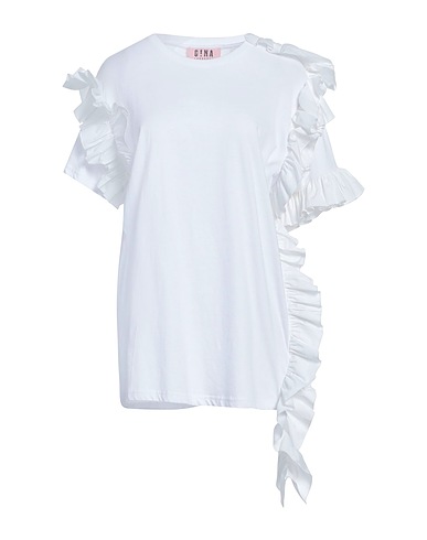 t-shirt, jersey, solid color with print, ruffles, brand logo, crewneck, short sleeves, hand wash, do not bleach, do not tumble dry