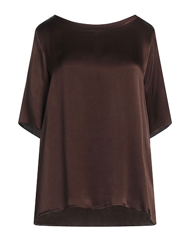 top, satin, solid color, no appliqués, crewneck, short sleeves, side slit hemline, machine wash or dry clean, do not bleach, do not tumble dry