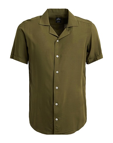 slim-fit shirt, woven, solid color, brand logo, camp collar, short sleeves, machine wash or dry clean, do not bleach, do not tumble dry