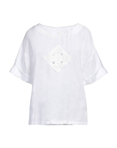 top, woven, solid color with appliqués, embroidered, crewneck, short sleeves, machine wash or dry clean, do not bleach, do not tumble dry
