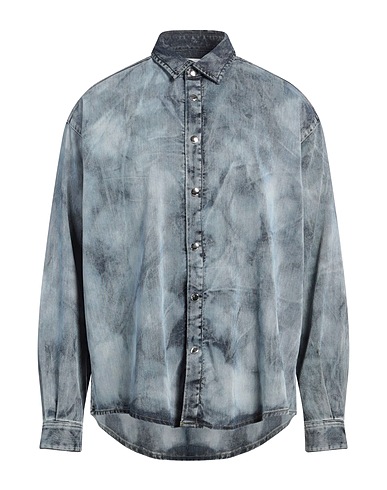 denim, stretchy fabric, tie-dyed, brand logo, medium wash, classic collar, long sleeves, buttoned cuffs, snap fastenings, hand wash or dry clean, do not bleach, do not tumble dry