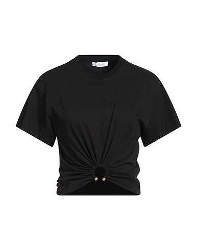 t-shirt, jersey, solid color with appliqués, gathered, brand logo, embellished, crewneck, short sleeves, hand wash, do not bleach, do not tumble dry, this brand runs small
