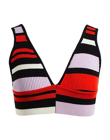 crop top, knitted, ribbed, lightweight knit, striped, no appliqués, deep neckline, sleeveless, machine wash, do not bleach, do not tumble dry