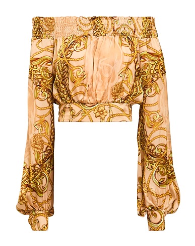 crop top, satin, multicolor, brand logo, off-the-shoulder, long sleeves, buttoned cuffs, dry clean, do not bleach, do not tumble dry