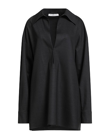 top, woven, stretchy fabric, solid color, no appliqués, deep neckline, long sleeves, hook fastenings, hand wash or dry clean, do not bleach, do not tumble dry