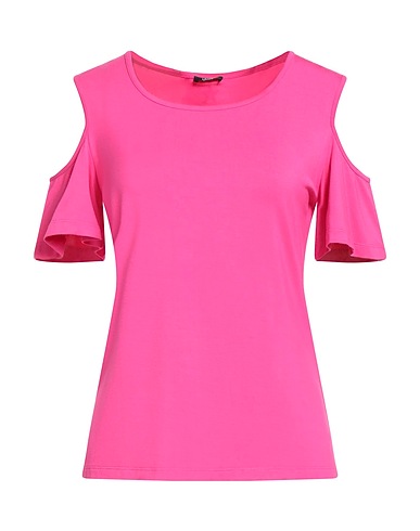 t-shirt, jersey, stretchy fabric, solid color, brand logo, cold-shoulder, short sleeves, machine wash, do not bleach, do not tumble dry