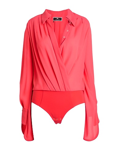 crepe, solid color with appliqués, brand logo, button-embellished, deep neckline, long sleeves, shoulder pads, buttoned cuffs, do not dry clean, do not bleach, do not tumble dry, this brand runs small