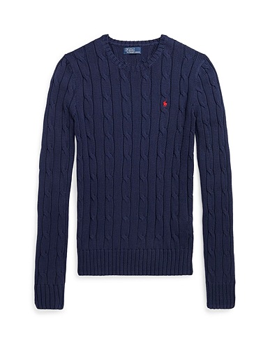 knitted, cable stitch, medium-weight knit, brand logo, solid color, crew neck, long sleeves, no pockets