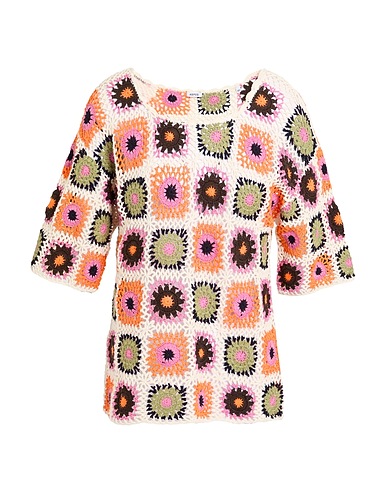 crochet-knit, multicolor, no appliqués, crewneck, short sleeves, hand wash or dry clean, do not bleach, do not tumble dry