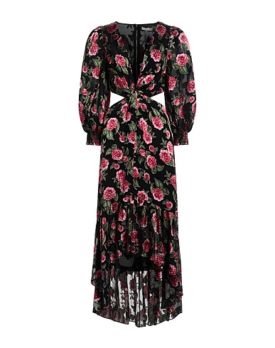 crepe, bow-detailed, cutout, floral-print, deep neckline, 3/4 length sleeves, elasticated cuffs, fully lined, zipper fastening, no pockets, side slit, frilled hemline, flared dress