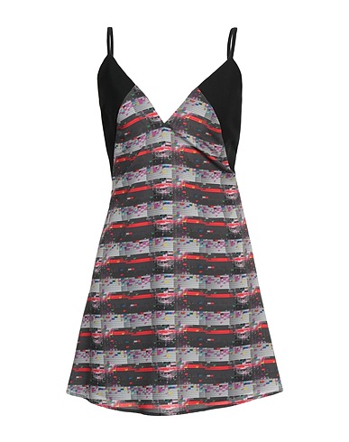 crepe, no appliqués, multicolor pattern, deep neckline, sleeveless, fully lined, no pockets, stretch, trapeze style