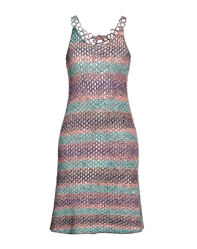wool, lightweight knit, metal applications, open back, multicolor, scoop neckline, sleeveless, unlined, no pockets, flared dress